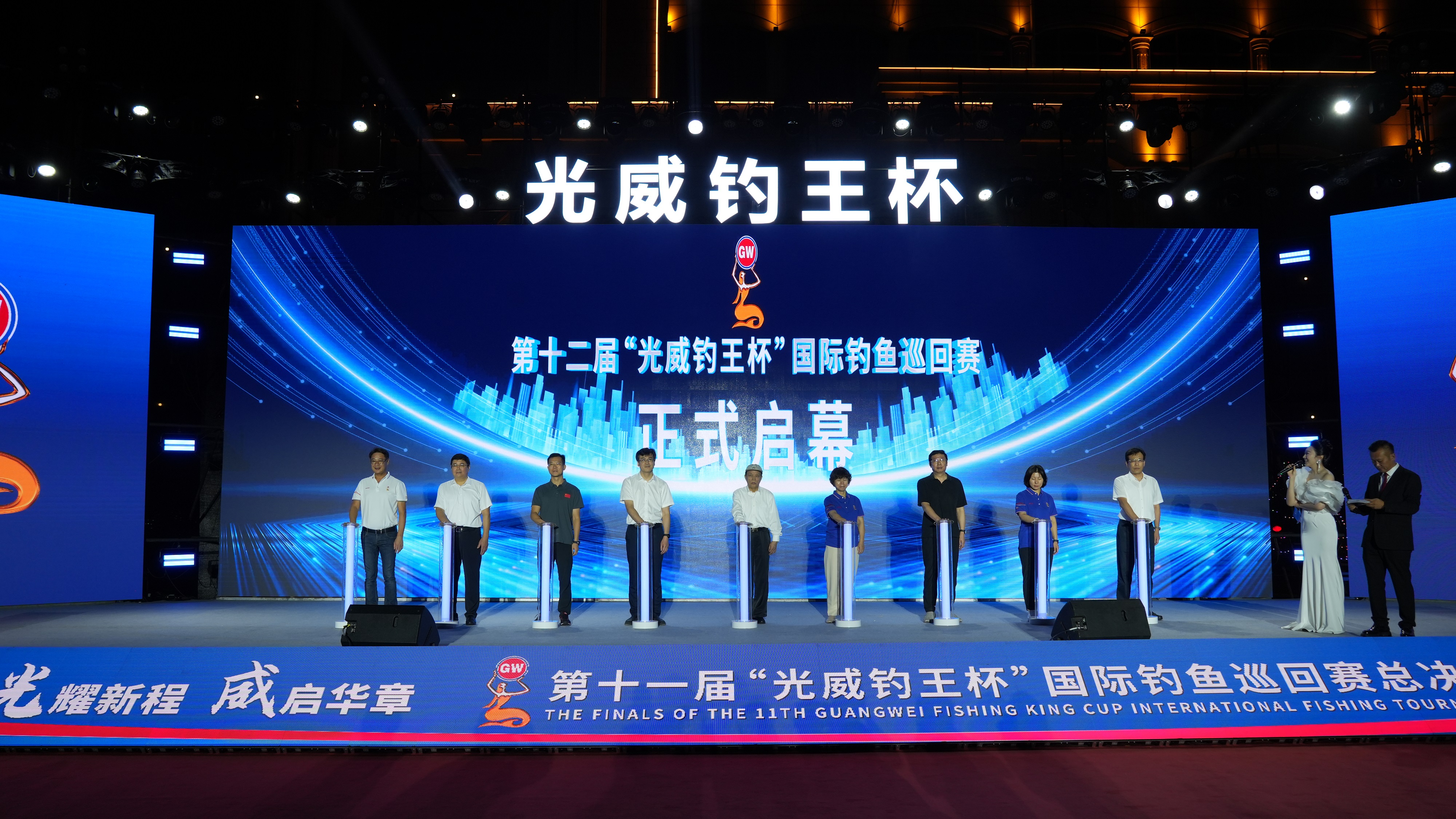 盛典的高光時刻,不止于新王加冕。各位領(lǐng)導(dǎo)共同上臺,按下第十二屆 “光威釣王杯” 國際釣魚巡回賽啟動鍵。
